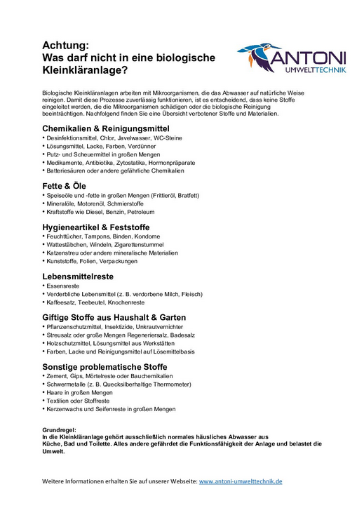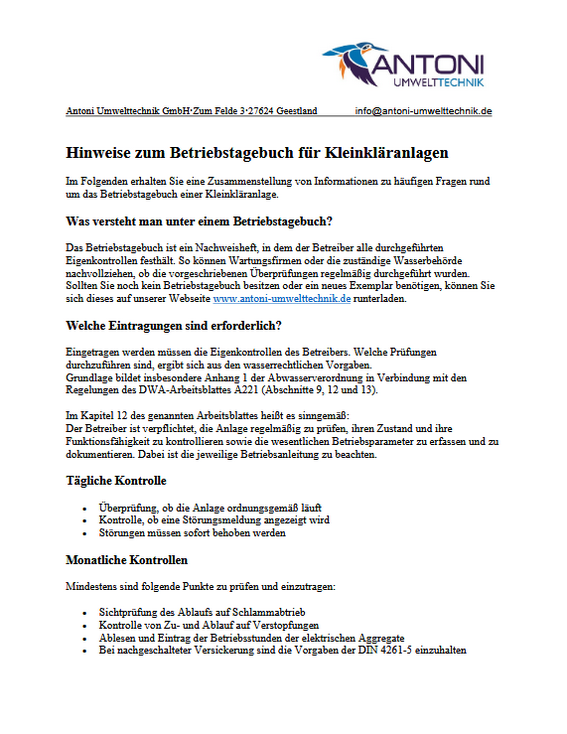 Hinweis Betriebshandbuch für Kleinkläranlagen